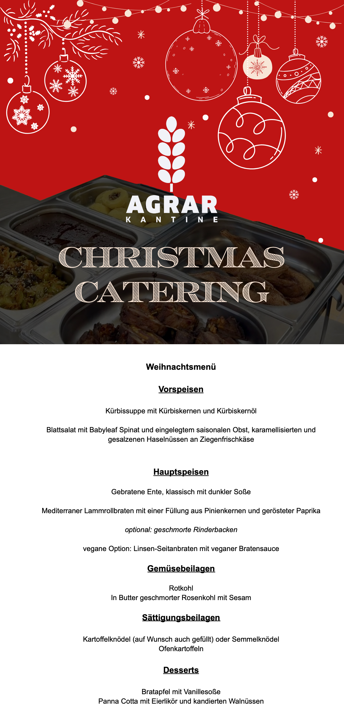 Die Agrar Kantine serviert Nachhaltigkeit und Regionalität mit internationaler Ausrichtung. Unter präziser Orientierung an den individuellen Wünschen der Kunden wird durch den Weg des Geschmacks ein nachhaltiges Erlebnis geschaffen und das Gefühl der Heimat kreiert.